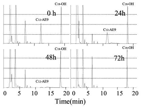 用高效液相色譜法分析生物降解過程中AE 的色譜圖如圖8 所示,其中10 毫克/升C12-AE9 的峰出現(xiàn)在11 分鐘的保留時間,作為內(nèi)標的C18 醇出現(xiàn)在18 分鐘的保留時間。 在 8 分鐘的保留時間之前觀察到主要由衍生產(chǎn)物引起的干擾峰。 10mg/L AE9 的大部分峰在 48 小時后消失(圖 8),而圖 3 中此時基于需氧量的生物降解保持 35%。此時表面張力值達到約 72.8 mN/m . 因此,表明AE9在其生物降解率低于50%的時間內(nèi)失去了其界面活性和水生毒性。