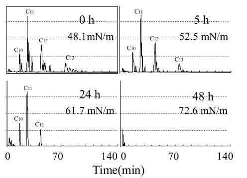 使用商用 AE8 進行生物降解測試獲得的結(jié)果如圖 9 所示,其中 C12-AE8 和 C14-AE8 的峰分別在保留時間 11 分鐘和 14 分鐘附近觀察到。 觀察到18分鐘內(nèi)標峰和8分鐘前的干擾峰以及圖8中AE9的結(jié)果。24小時后觀察到AE8峰面積減少,72小時峰消失。 144 小時(6 天)后表面張力值達到約 72.8 mN/m,而生物降解率僅為 45%,死亡率在 48 小時時降至 0%(圖 5)。 與 10 mg/L AE9 的結(jié)果相似,20 mg/L AE8 的水生毒性在基于需氧量的生物降解增加到 50% 之前消失。