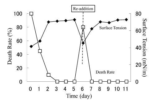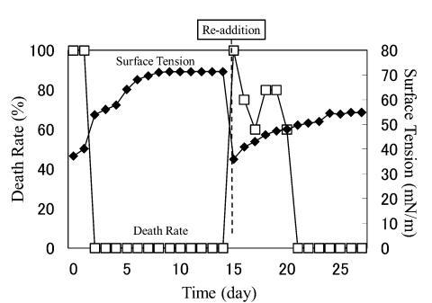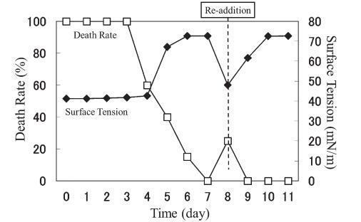 結(jié)果,在第8天重新加入LAS使試液的表面張力降低到與初始階段相同的水平,但死亡率沒有達到100%。 重新添加后不久,觀察到表面張力值迅速增加,水生毒性和死亡率迅速下降。 重新添加 LAS 后,死亡率暫時增加,但隨后立即降至 0%。 重新添加后第 2 天,表面張力值達到約 72.8 mN/m。