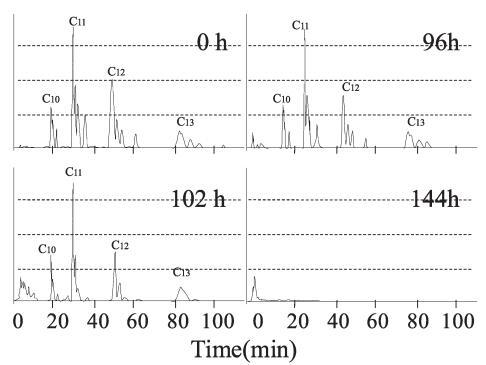 生物降解過程中10mg/L LAS的色譜圖,通過HPLC使用UV檢測器進行分析,如圖6所示。在相應的保留時間(RT)處出現(xiàn)不同碳鏈數(shù)的峰組:16至19.5分鐘為C10,26.5至32.5分鐘是C11,44到55分鐘是C12,74到95分鐘是C13。 由于苯基的結(jié)合位置不同,每個峰組都包含異構(gòu)體峰。 參考標準(和光純藥工業(yè)株式會社)用于識別每個峰。