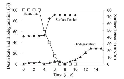AE 的生物降解速度比 LAS 快。 對于 10 mg/L AE9,BOD 和表面張力值在測試開始后立即開始增加,死亡率立即下降(圖 3)。 表面張力值在第 2 天達到約 72.8 mN/m。 該結(jié)果與之前的報告一致9),其中比較了基于 CO2 量的生物降解率(測量的 CO2 產(chǎn)量/理論 CO2 產(chǎn)量)和 CTAS 的降低率。 也就是說,Strum 研究中 CTAS 的降低對應于我們研究中表面張力值的增加。