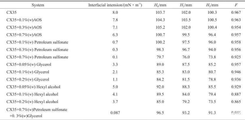 CX35雖具有降低油水界面張力的能力,但加入CX35后,油水界面張力仍大于10-1mN/m數(shù)量級(jí)。離子型表面活性劑與醇混合可降低油水界面張力,但醇會(huì)影響驅(qū)油劑的起泡性能。不同復(fù)配體系的油水界面張力見(jiàn)表1。由表1可看出,石油磺酸鹽降低界面張力的效果尤為突出。這是因?yàn)椋突撬猁}含苯環(huán)及類(lèi)苯結(jié)構(gòu),且苯環(huán)上有疏水碳鏈,與原油中的瀝青質(zhì)和芳烴等物質(zhì)結(jié)構(gòu)相似,故石油磺酸鹽易吸附在油水界面上從而降低油水界面張力。同時(shí),石油磺酸鹽還可提高驅(qū)油劑在空隙中的洗油效率,也可通過(guò)乳液產(chǎn)生的阻力提高驅(qū)油劑的波及效率。在m(CX35)∶m(石油磺酸鹽)∶m(甘油)=1∶0.7∶0.3的條件下得到的ZX35的起泡高度可達(dá)到95 mm以上,穩(wěn)泡能力達(dá)到0.946。