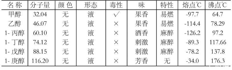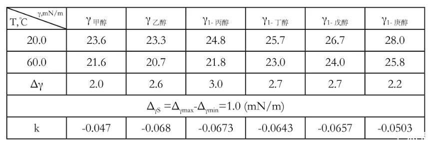 由于不同液態(tài)醇類的液態(tài)性質(zhì)不同,其表面張力變化的程度如下表: