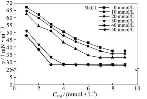 三種無機鹽的加入可以降低表面張力;當NaCl、CuCl2,F(xiàn)e(NO3)3的濃度在40,1.25,1.25 mmol/L以下范圍內(nèi),在一定量SDS表面活性劑溶液濃度下,隨著無機鹽濃度的增加,表面張力逐漸減小;當超過無機鹽添加濃度上限后,在一定量的SDS表面活性劑溶液濃度下,隨著無機鹽濃度的增加,表面張力將達到穩(wěn)定。同時,無機鹽濃度的增加可以降低表面張力達到最低時所對應的SDS表面活性劑溶液濃度值(Ct),各體系下的Ct即為cmc值,當三種無機鹽添加濃度達到上限值后,表面張力達到最小值時所對應的SDS表面活性劑溶液濃度都是3 mmol/L,加入Fe(NO3)3、CuCl2和NaCl之后,溶液的表面張力由37.29 mN/m分別降至21.35,23.44,27.53 mN/m。