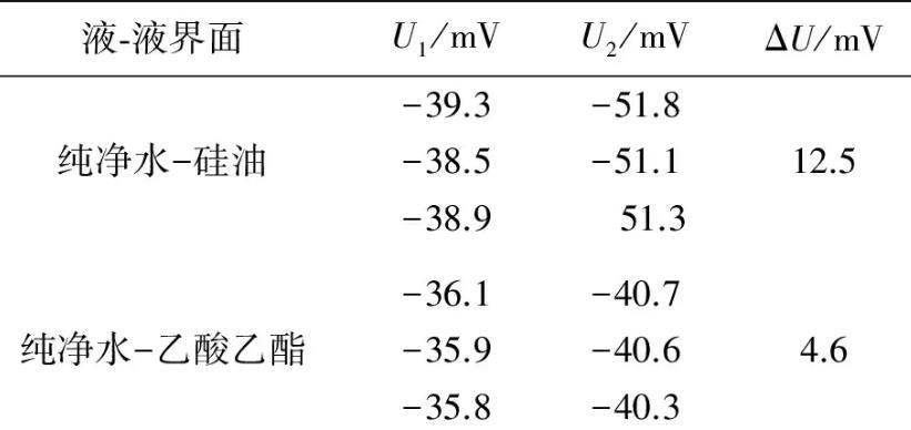 實(shí)驗測量所用金屬吊環(huán)的外徑、內(nèi)徑分別為0.034 96 m和0.033 10 m.在20℃實(shí)驗條件下,采用自制2種液體間界面張力的動態(tài)實(shí)時測量儀,測量了純凈水-硅油和純凈水-乙酸乙酯間的界面張力.測量出金屬吊環(huán)由液體I中完全進(jìn)入液體Ⅱ的過程中,液體I的液膜被拉斷前電壓的最大值U1,拉斷后趨于穩(wěn)定時的電壓值為U2,數(shù)據(jù)結(jié)果如表1所示。