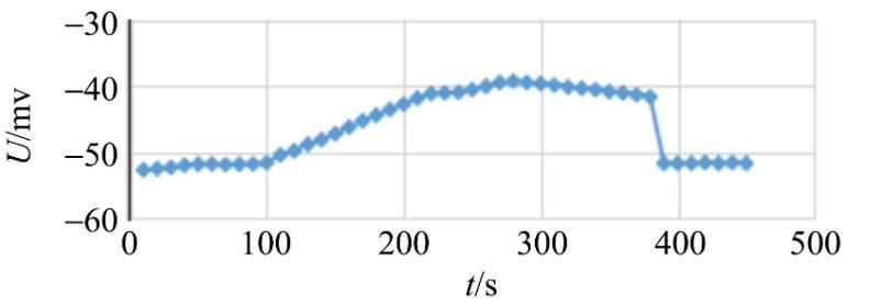 實(shí)驗過程:接通電源,將儀器預(yù)熱15min;在傳感器橫梁端頭的小鉤上掛砝碼盤并進(jìn)行定標(biāo);將金屬吊環(huán)清潔干凈,調(diào)平后掛在傳感器的小鉤上;實(shí)驗時,先將吊環(huán)置于密度較大的液體Ⅰ中,然后再注入密度較小的液體Ⅱ,調(diào)節(jié)流速調(diào)節(jié)器控制從容器底部緩慢勻速排出液體的流速,測量出電壓U隨時間t的變化曲線。圖2為純凈水和硅油的界面張力測量過程中電壓U隨時間t的變化曲線。