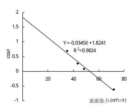 參照Zisman作圖法,選取潔凈、無病斑的劍麻葉片,用刀片切成規(guī)則平整的小塊(避開葉脈),用膠水將其固定在載玻片上,使用微量注射器分別吸取2μL已知表面張力的液體(乙二醇、DMSO、DMF和去離子水),點(diǎn)滴在劍麻葉片表面,置于接觸角測量儀上,記錄此時液滴所成的接觸角θ,每個處理重復(fù)10次,取平均值。以這4種液體的表面張力值為橫坐標(biāo),cosθ為縱坐標(biāo),得到一條直線回歸方程,在cosθ=1(接觸角為0)處得到相應(yīng)的表面張力值即為劍麻葉片的臨界表面張力值。