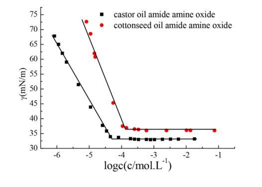 圖 4. 表面張力與水溶液摩爾濃度的對(duì)數(shù) 蓖麻油酰胺氧化胺和棉籽油酰胺氧化胺在 25攝氏度