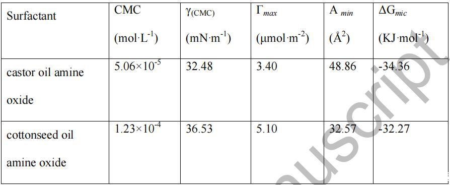 由表2可知,蓖麻油酰胺氧化胺和棉籽油酰胺 氧化胺將水的表面張力降低到最小值約 在 5.06×10-5 mol/L 的濃度下為 32.48 mN/m,在 5.06×10-5 mol/L 的濃度下為 36.53 1.23×10-4 mol/L,表明它們的表面活性很高。 和....相比 一些已報(bào)道的氧化胺表面活性劑,[12] 如十六烷基二甲基 氧化胺、十八烷基二甲基氧化胺和椰油酰胺丙基二甲基胺 氧化物等,其CMC值通常在10-4范圍內(nèi) ~10-3 mol/L, 這些 CMC 值較低。 這可能是因?yàn)閹追N酰胺的混合物 氧化胺具有協(xié)同增強(qiáng)的作用,提高了表面 活動(dòng)總體上。 還可以發(fā)現(xiàn),蓖麻油的 CMC 和 γ(CMC) 值 酰胺氧化胺遠(yuǎn)低于棉籽油酰胺氧化胺,后者 可能是由于蓖麻油酰胺氧化胺中存在-OH。 [13] 在 另外,從表 2 中的數(shù)據(jù)可以看出,蓖麻油的Γmax 值 酰胺氧化胺低于棉籽油酰胺氧化胺,而 前者的Amin值大于后者。 這一結(jié)果可能歸因于 烷基鏈的長(zhǎng)度。 此外,ΔGmic 的負(fù)值表明 9 在 25 oC 時(shí),膠束化是自發(fā)的,這意味著這兩種天然植物油 酰胺胺氧化物在空氣-水界面有極好的吸收能力 在溶液中形成膠束。
