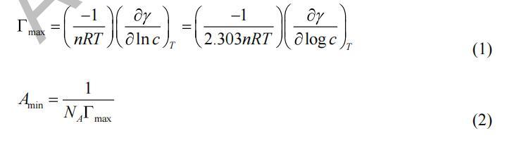 通過(guò)分析平臺(tái)獲得最小表面張力(γCMC)值 地塊的區(qū)域。 確定臨界膠束濃度 (CMC) 值 從表面張力的斷點(diǎn)與濃度的對(duì)數(shù) 曲線。 最大表面過(guò)量濃度(Γmax)和最小表面積 (Amin) 在空氣/水界面被每個(gè)表面活性劑分子占據(jù)的計(jì)算公式為 吉布斯吸附方程: