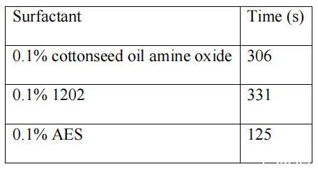 為了比較,還列出了正十二烷基二乙醇胺(1202)和醇醚硫酸鈉(AES)的水分離時(shí)間。 從表 3 可以看出,在表面活性劑濃度為 0.1% 時(shí),蓖麻油酰胺 氧化胺和棉籽油酰胺氧化胺有更長(zhǎng)的水分離時(shí)間 比AES,這意味著合成的兩種天然植物油酰胺胺 氧化物具有良好的乳化能力,尤其是蓖麻油酰胺氧化胺。 這 棉籽油酰胺氧化胺的乳化能力與1202相近。 還發(fā)現(xiàn)蓖麻油氧化胺的乳化能力優(yōu)于蓖麻油氧化胺 棉籽油氧化胺,這也歸因于平均烷基鏈長(zhǎng)。 [14] 此外,作為乳化劑,它們可以在較寬的pH范圍內(nèi)使用。