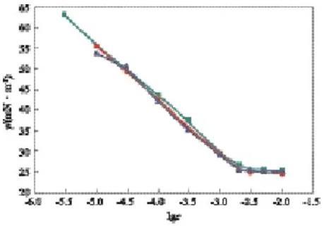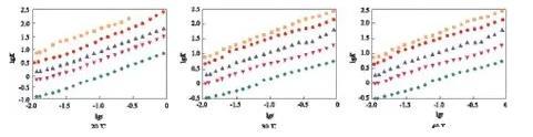 在lgc=-3.00時,可看出較完整的動態(tài)表面張力降低曲線,開始時表面張力接近溶劑的表面張力,隨時間的延長表面張力先快速下降,降至一定數(shù)值后,降幅趨緩,在一段時間內(nèi)基本保持不變。因為氣/液界面新生成時,GSS362尚未在表面吸附,界面張力為溶劑的表面張力,隨著時間的延長,表面活性劑分子開始在表面吸附,氣/液界面張力降低,隨著吸附的進行,表面逐步趨于飽和,表面活性劑分子在表面吸附的速率下降,因而動態(tài)表面張力下降速率變慢,趨于平衡。