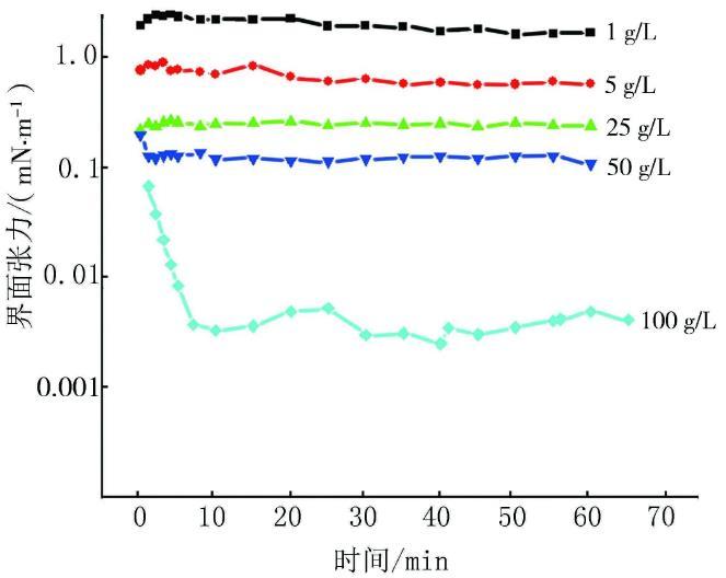 為了選擇合適界面張力體系來進行驅(qū)油實驗,實驗室內(nèi)配置了礦化度分別為1,5,25,50,100 g/L,質(zhì)量分數(shù)為0.2%的9AS-3-0溶液,并對其與原油之間的界面張力進行了測量。實驗結(jié)果見圖1。