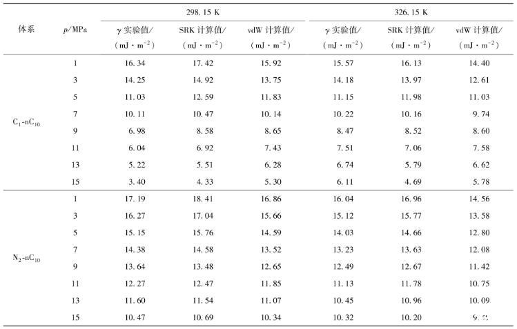 (2)與vdW模型和實驗數(shù)據(jù)對比表明:在相同的溫度下,隨著壓力的升高,C1-nC10和N2-nC10混合物在納米孔中的界面張力逐漸減小,SRK和vdW模型均能準確地預測界面張力。