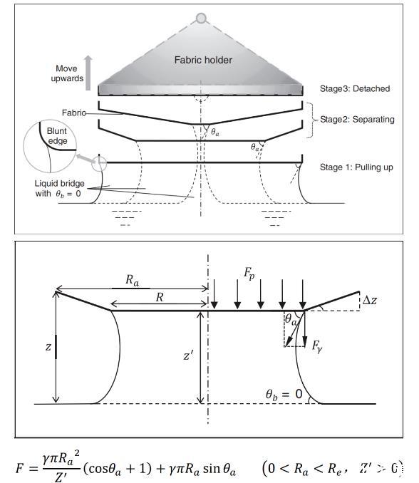 基于液體表面張力的理論模型從濕態(tài)貼附現(xiàn)象的成因出發(fā)進(jìn)行構(gòu)建,可預(yù)測分離過程第二階段(逐漸分離階段)中各種織物與液體之間的貼附力。