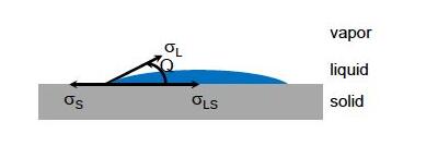 4、接觸角在在三種介質(zhì)的邊界面相交于一點(diǎn)的情形中,接觸線受到三個(gè)不同邊界面的表面張力,為了維持平衡,表面張力的合力在這些方向上的分量必須等于零,這就要求三個(gè)邊界面交成一定的角度。