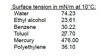 2、同種液體,在不同溫度時(shí)表面張力會(huì)不同比如下面表格溫度越低表面張力越大;